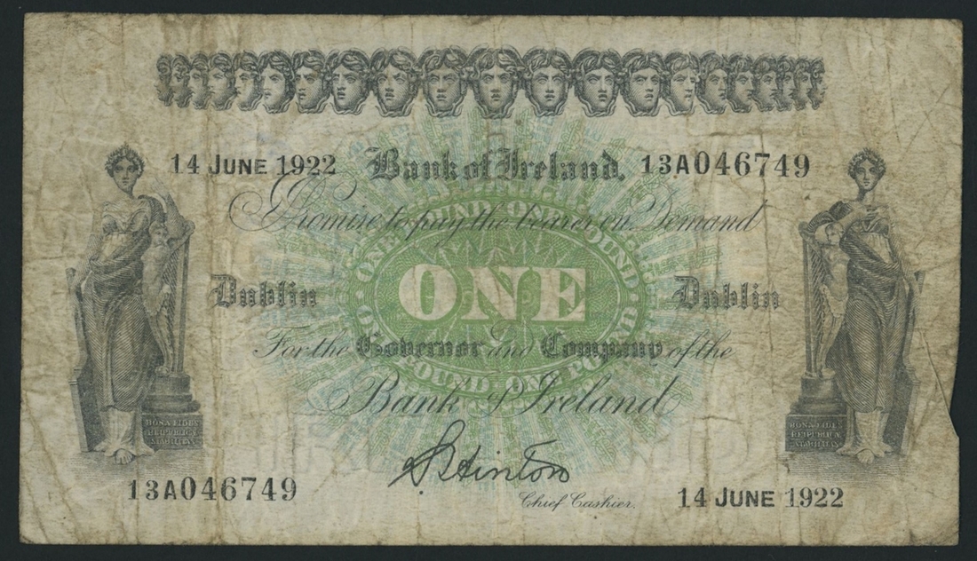 Bank of Ireland, £1, Dublin, 14th June 1922, lowest known serial number for prefix, 13A046749, (PMI BA 83), about fine