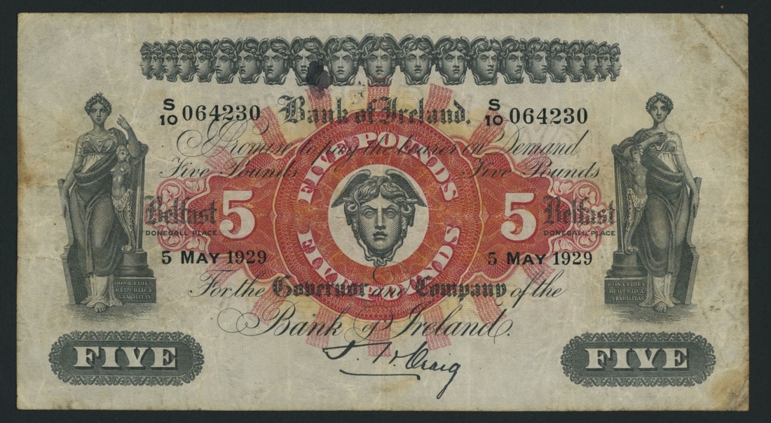 Bank of Ireland, £5, Belfast, 5th May 1929, serial number S10 064230, (PMI BA 97), some discolouration around edges, fine