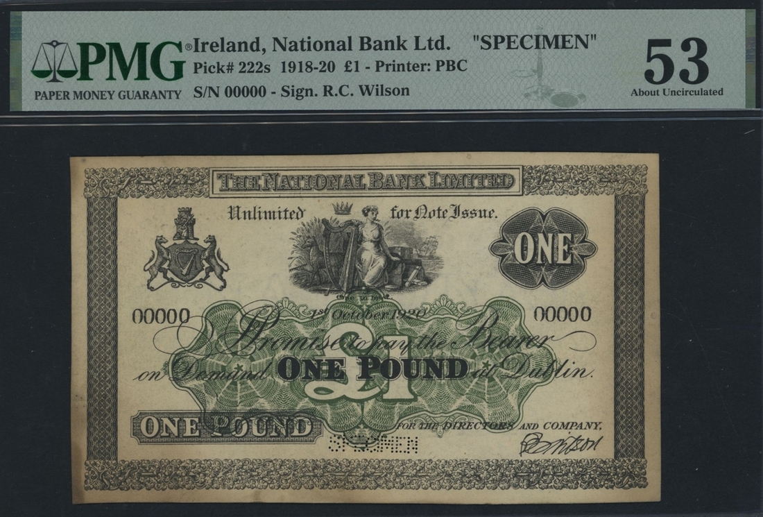 National Bank Limited, Ireland, *TOP POP* specimen £1, Dublin, 1st October 1920, serial number 00000, (Pick 222s, PMI NA 65s), in PMG holder 53 About Uncirculated, stains, highest graded note on PMG Census, rare