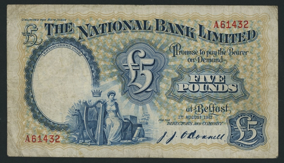 National Bank Limited, £5, Belfast, 1st August 1942, serial number A61432, (PMI NA 80), fine