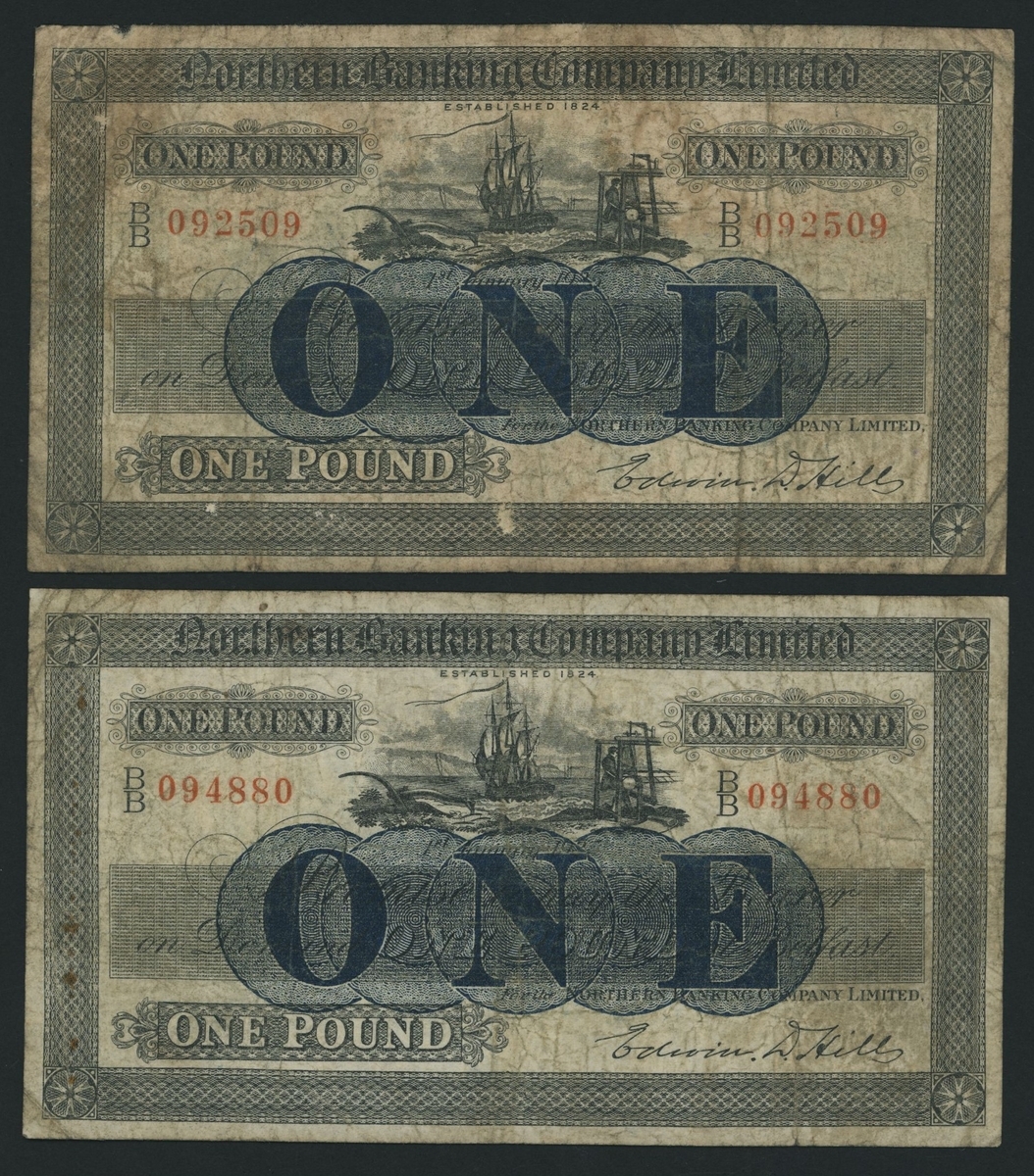 Northern Banking Company, [2] £1, 1st January 1925, serial number B/B 092509, 094880, (PMI NR 55), about fine, minor tears, paper pulls, some stains
