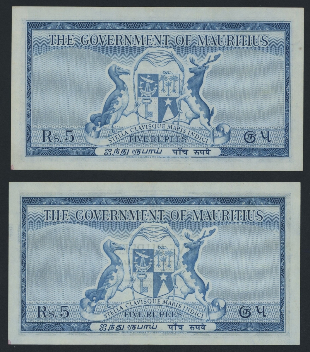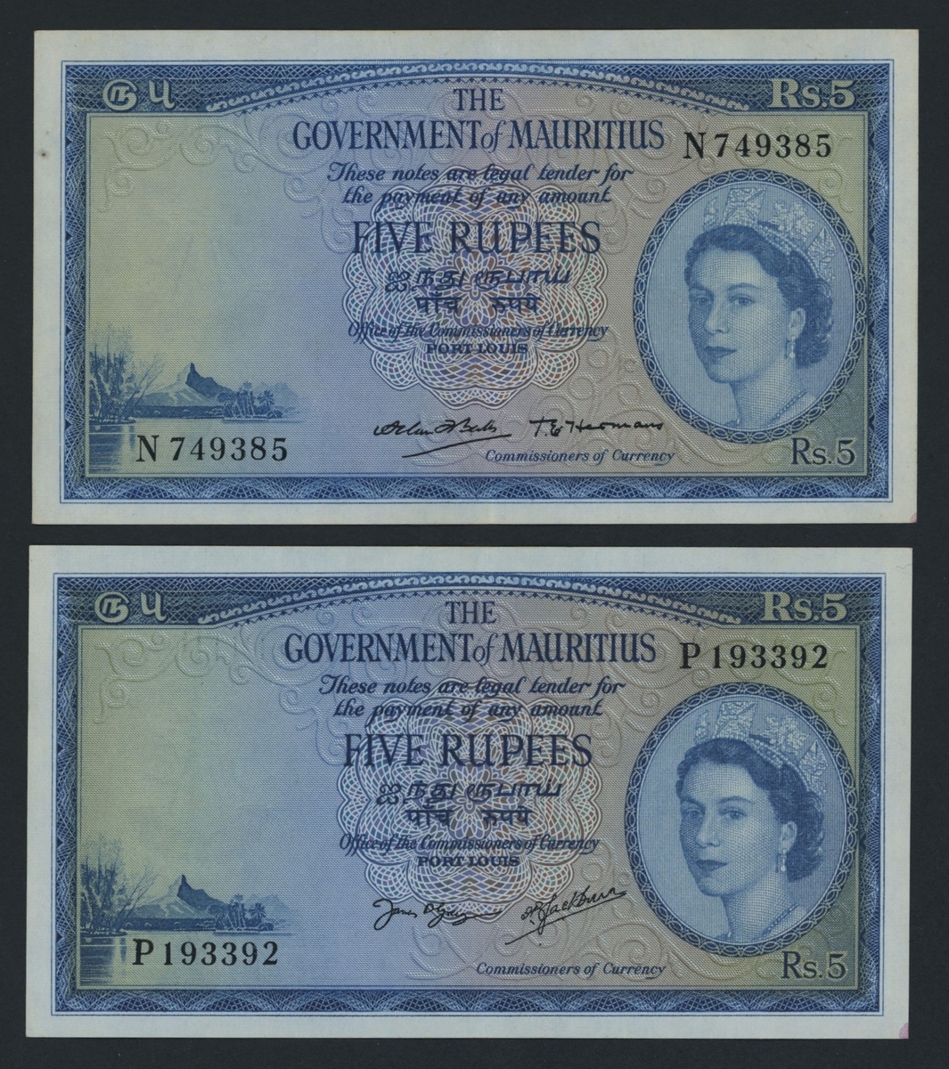 (x) Government of Mauritius, [2 notes] 5 Rupees, ND (1954), serial number N 749385, P 193392, (Pick 27), minor stains, otherwise extremely fine