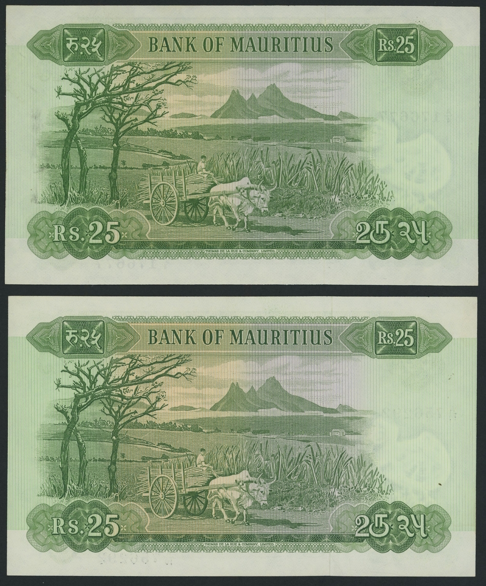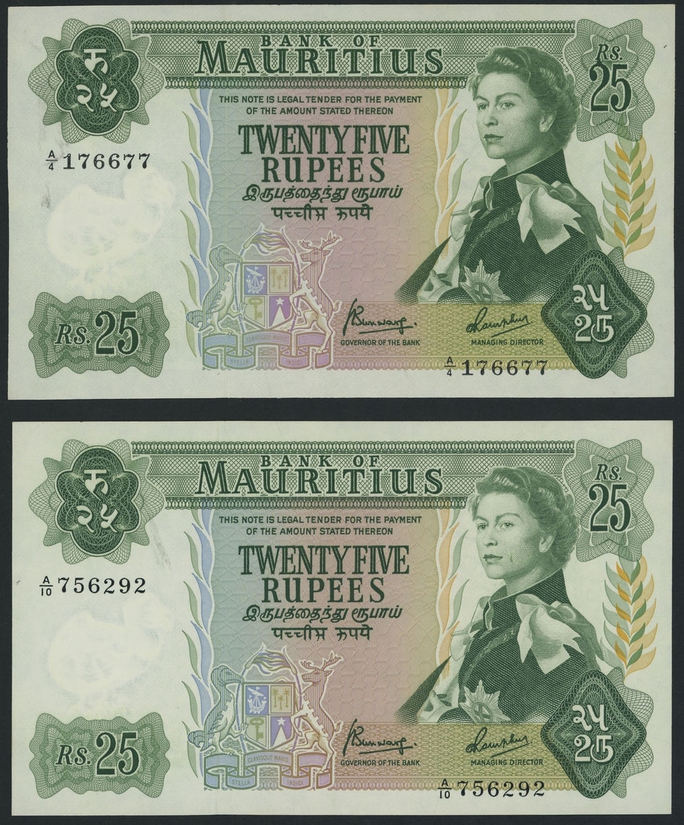 (x) Bank of Mauritius, [2 notes] 25 Rupees, ND (1967), serial number A/4 176677, A/10 756292, (Pick 32b), about uncirculated, 1mm tear at upper margin and small mark on portrait on one note (2 notes)