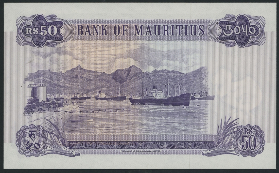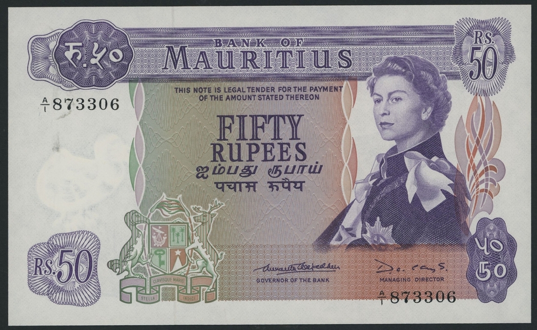 (x) Bank of Mauritius, 50 Rupees, ND (1967) serial number A/1 873306, (Pick 33b), uncirculated