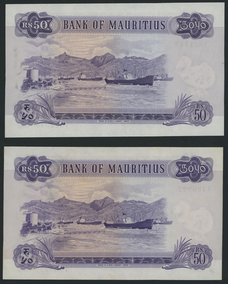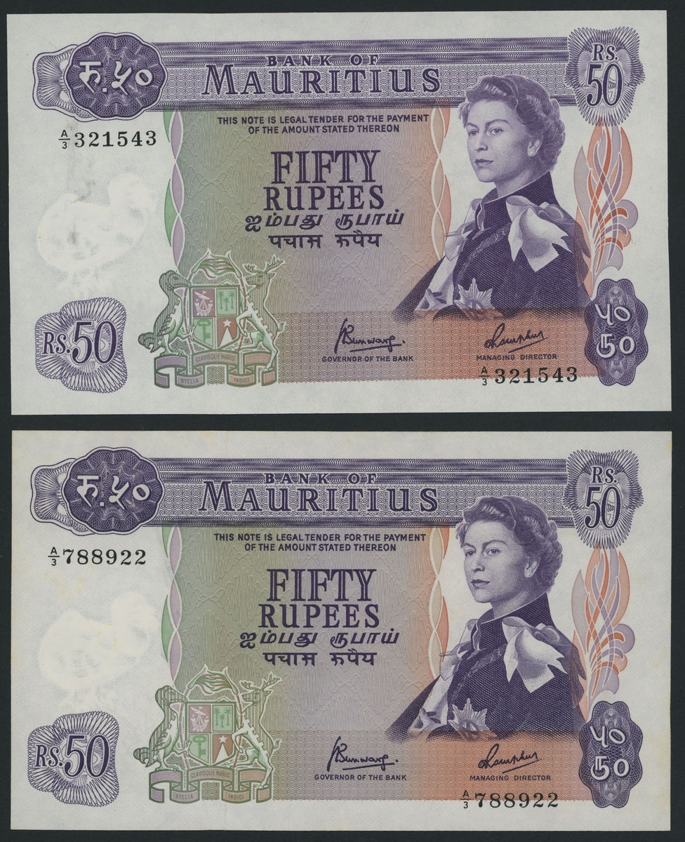 (x) Bank of Mauritius, [2 notes] 50 Rupees, ND (1954), serial numbers A/3 321543, A/3 788922, (Pick 33c), about uncirculated (2 notes)
