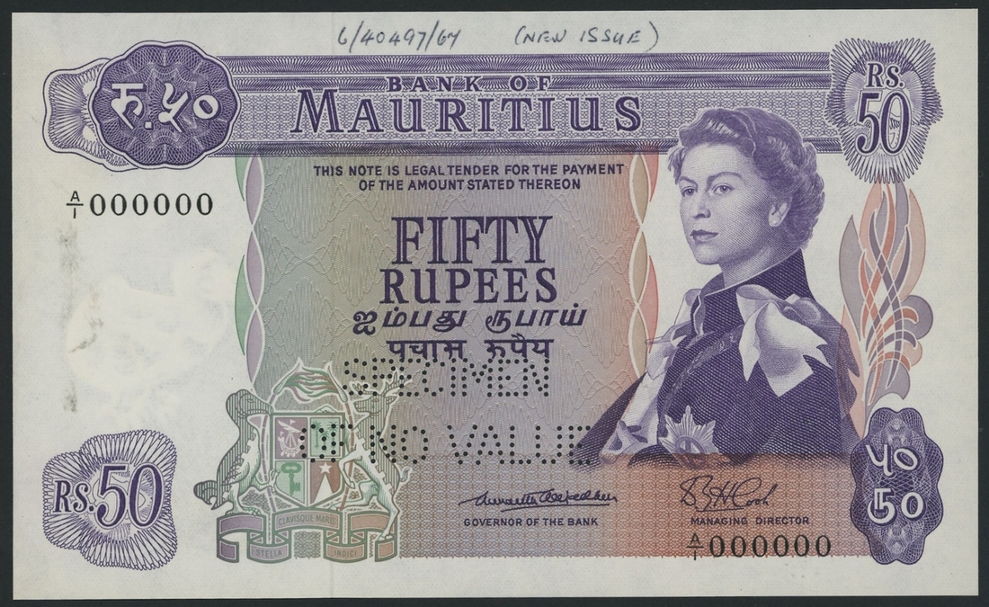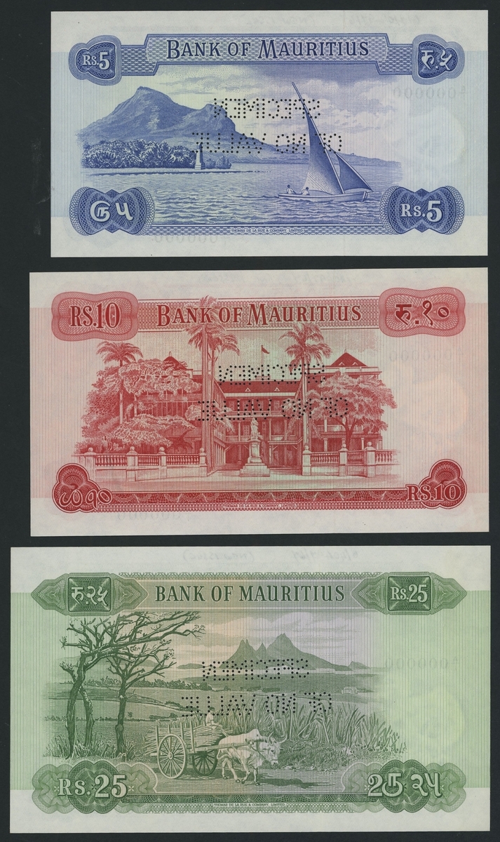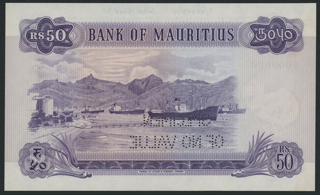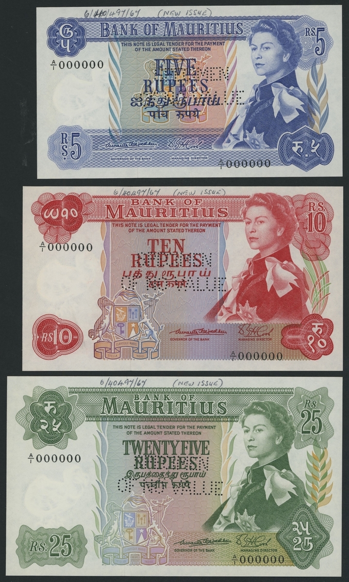 (x) Bank of Mauritius, [4 notes] set of specimens, 5, 10, 25 & 50 Rupees, ND (1967), serial numbers all A/1 000000, "Specimen of no value" perforated,