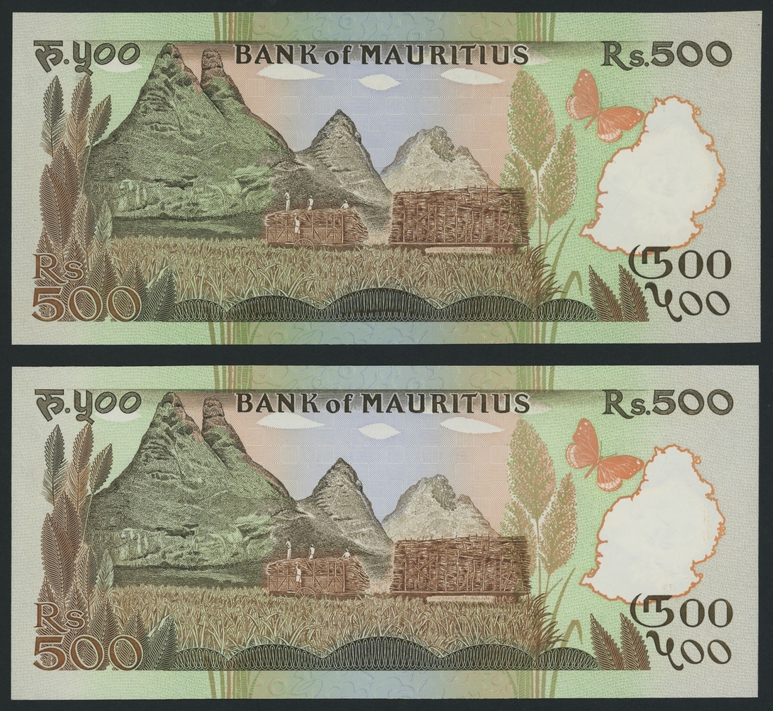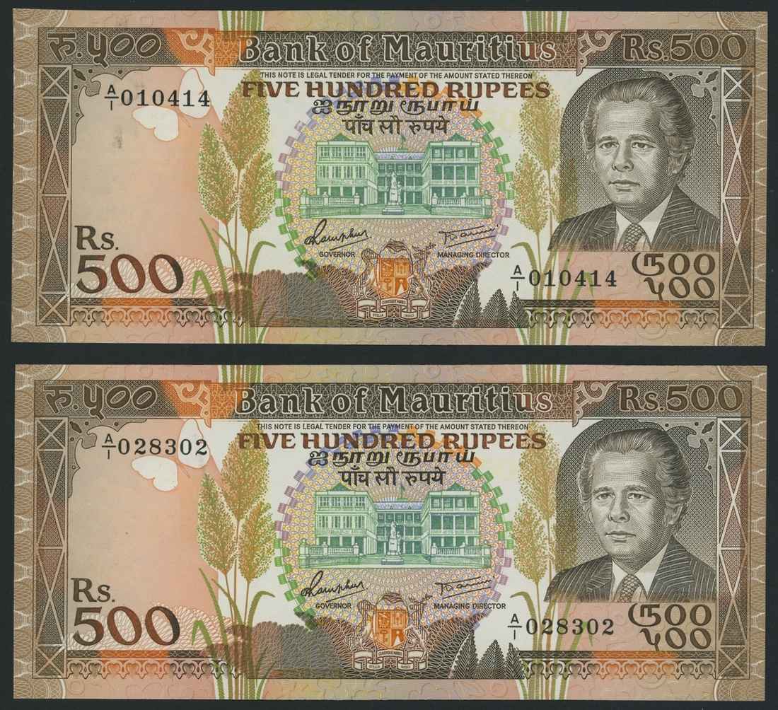 (x) Bank of Mauritius, [2 notes] 500 Rupees, ND (1988), serial numbers A/1 010414, A/1 028302, (Pick 40a), uncirculated (2 notes)