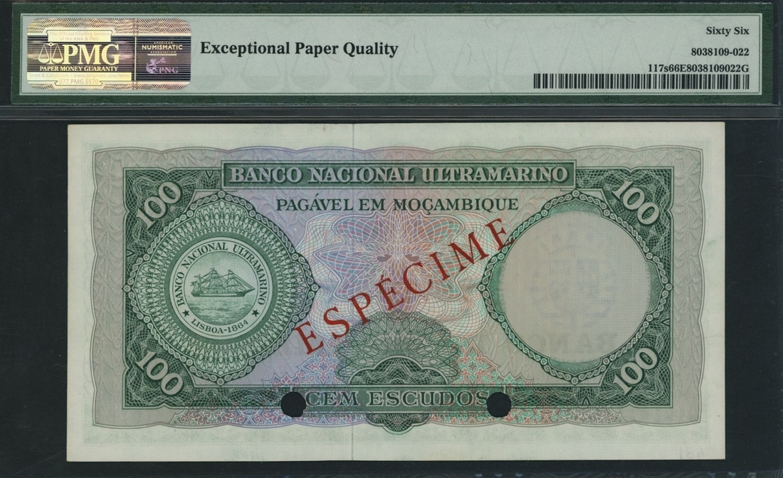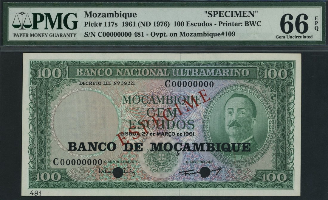 (x) Banco Nacional Ultramarino, Mozambique, specimen 100 Escudos, Lisbon, 27th March 1961, serial number C00000000, specimen number 481,