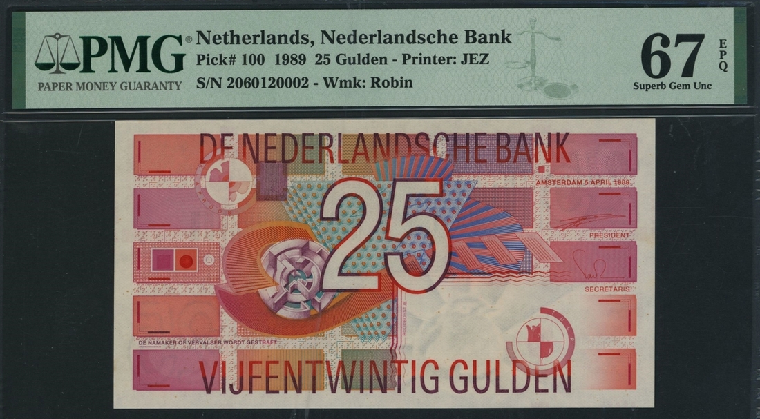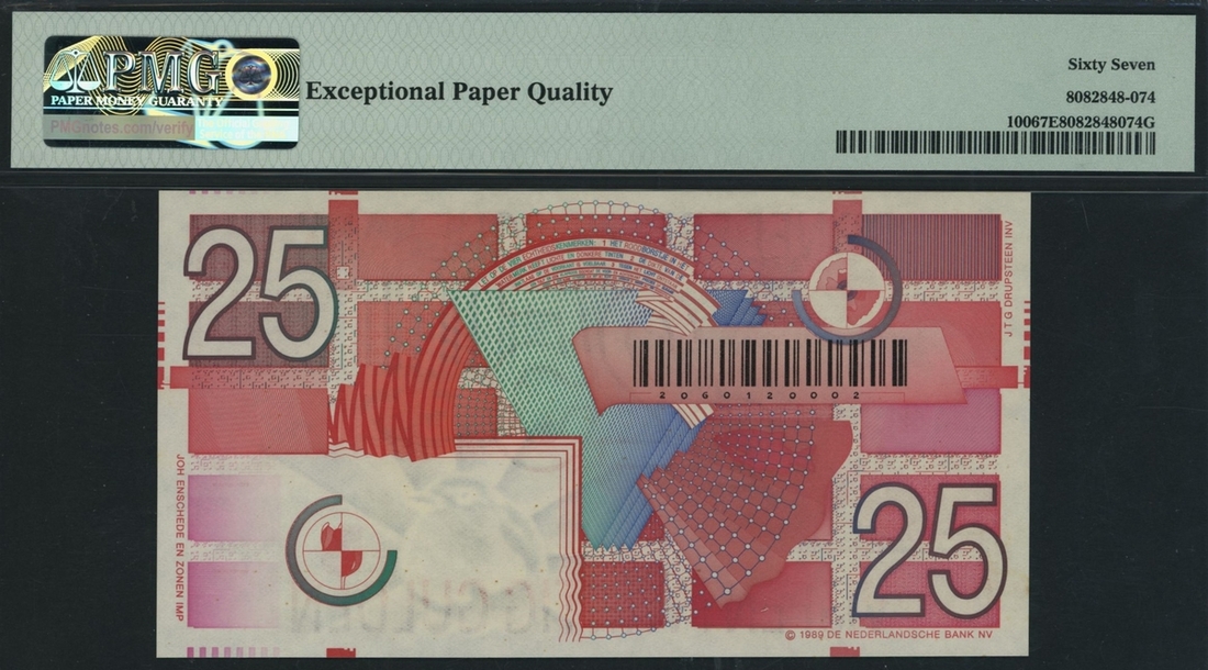 (x) Nederlandsche Bank, Netherlands, 25 Gulden, 1989, serial number 2060120002, (Pick 100), in PMG holder 67 EPQ Gem Uncirculated