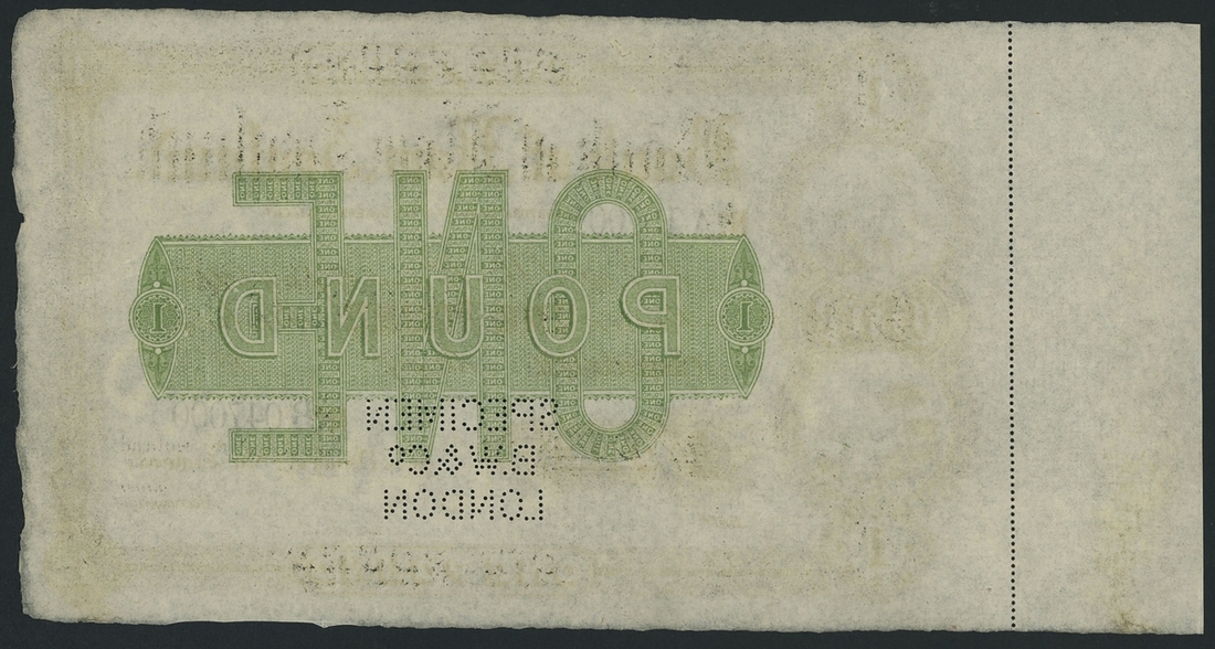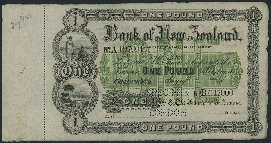 (x) Bank of New Zealand, printer's archival specimen £1, Christchurch, 18- (ca. 1881), serial number run A 197001-B 047000, no signatures,