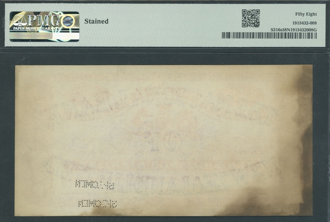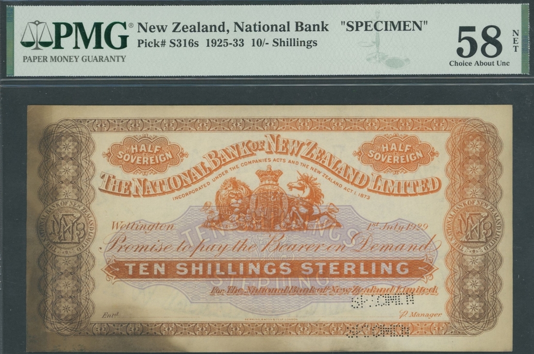 (x) The National Bank of New Zealand Limited, *TOP POP* specimen 10 Shillings, 1st July 1929 (1925-1933, (Pick S316s), in PMG holder 58 NET Choice About Uncirculated, stained, the Sole note for the type graded to date by PMG