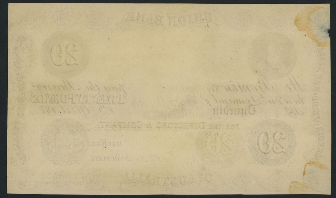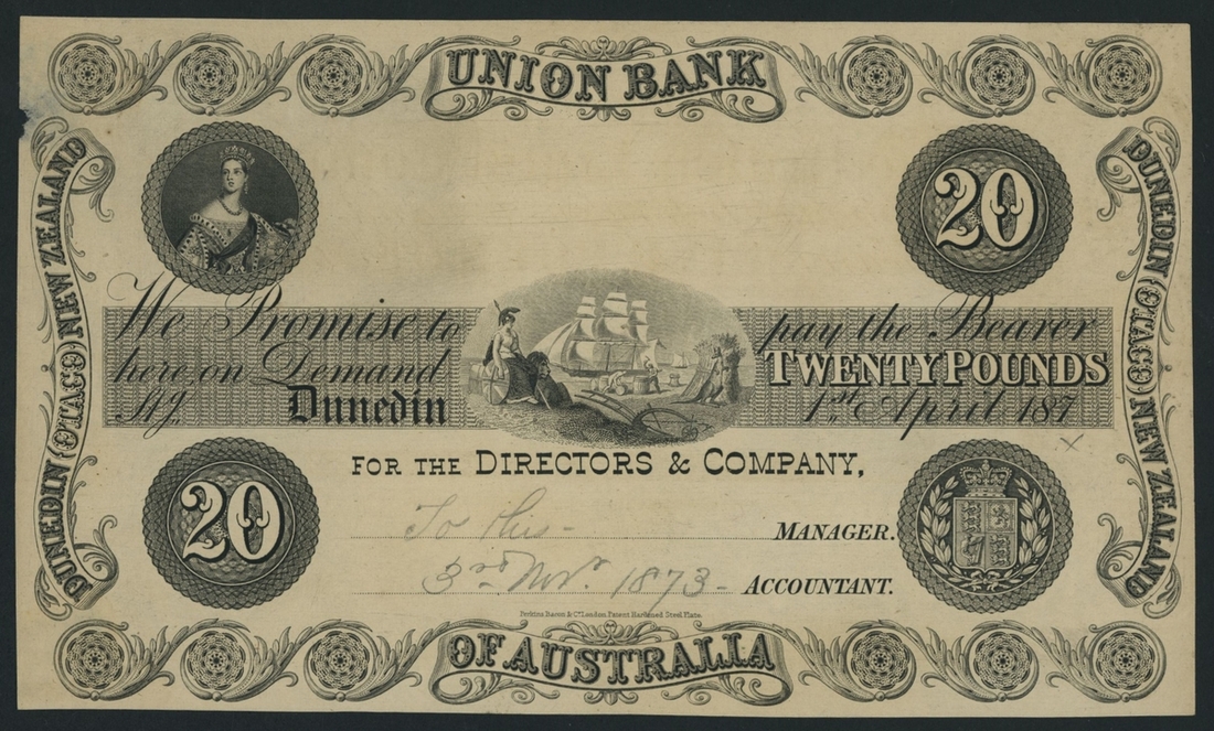 (x) Union Bank of Australia, New Zealand, £20, Dunedin, Otago, 3rd November 1873, no serial number, (Pick S349p, BNB B206cp), minor piece missing from upper left margin, otherwise extremely fine