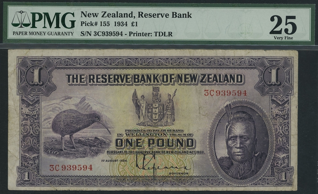 (x) New Zealand Reserve Bank, £1, 1st August 1934, serial number 3C939594, (Pick 155), in PMG holder 25 Very Fine