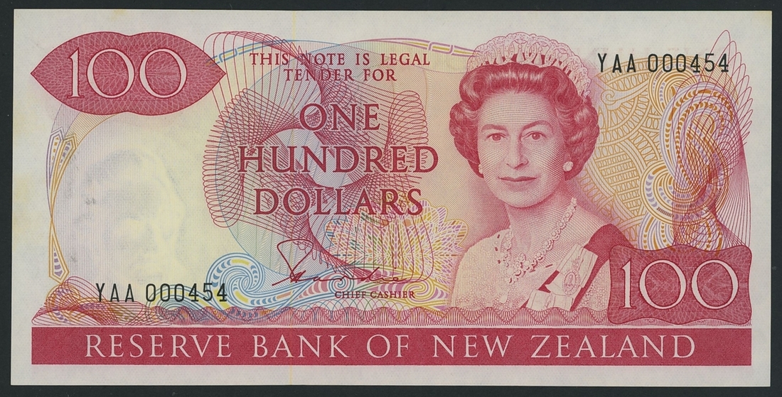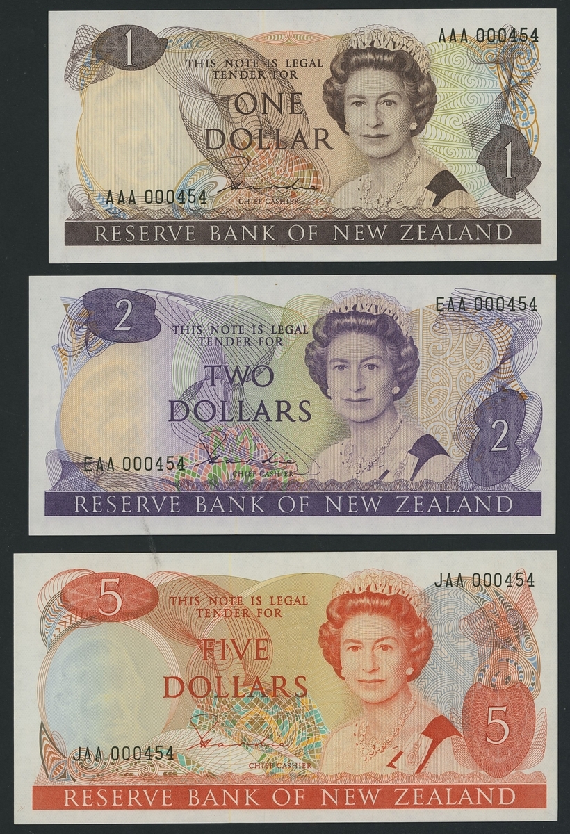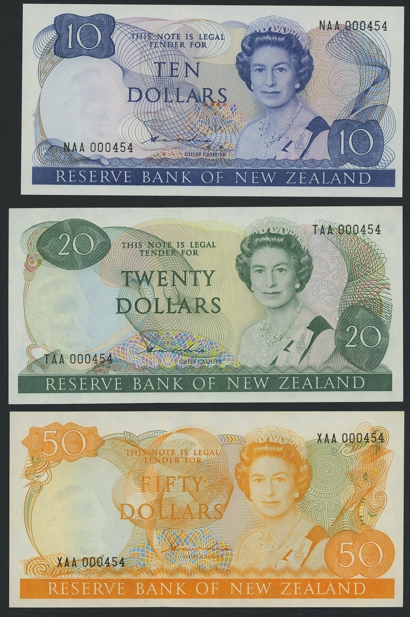 (x) Reserve Bank of New Zealand, [7 notes] complete set of 1, 2, 5, 10, 20, 50, 100 Dollars, ND (1981-92), matching low serial numbers 000454, (Pick 169a, 170a, 171a, 172a, 173a, 174a, 175a), uncirculated (7 notes)