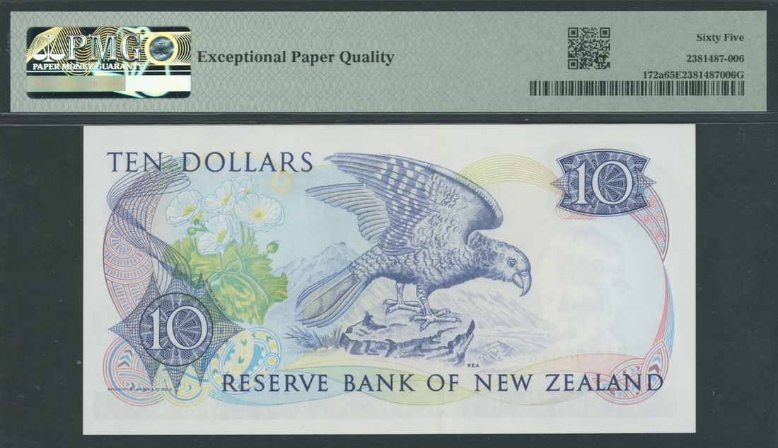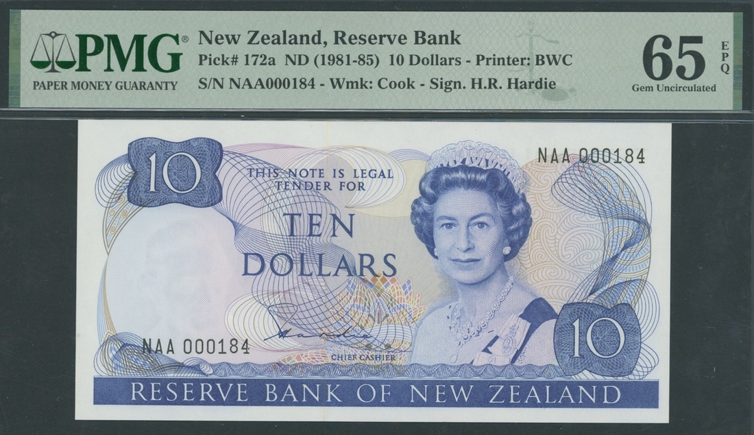 (x) Reserve Bank of New Zealand, 10 Dollars, ND (1981-85), serial number NAA000184, (Pick 172a, BNB 119), in PMG holder 65 EPQ Gem Uncirculated