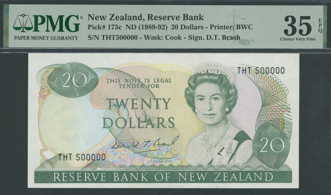 (x) Reserve Bank of New Zealand, 20 Dollars, ND (1989-92), serial number THT500000, (Pick 173c, BNB 120), in PMG holder 35 EPQ Choice Very Fine