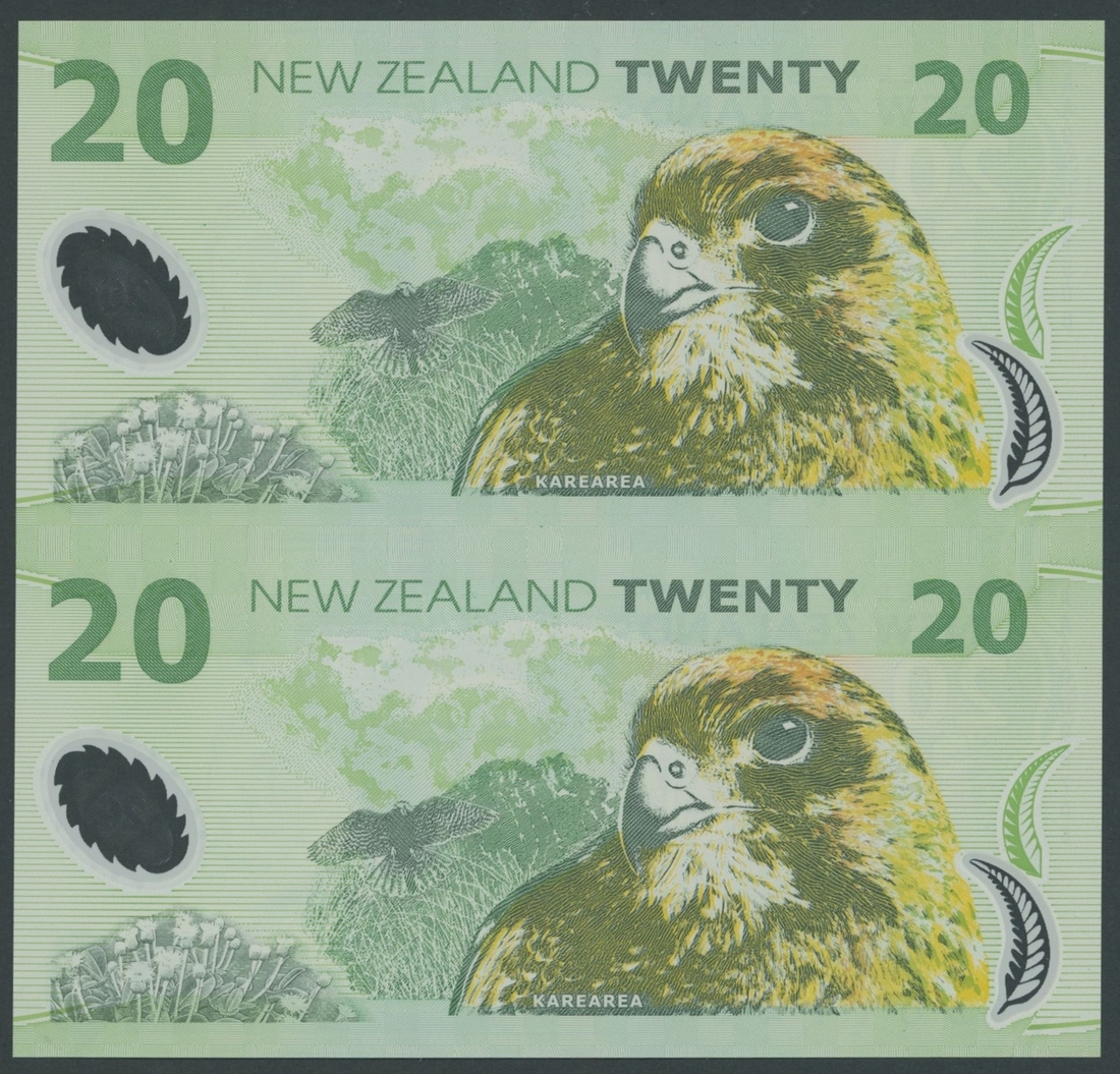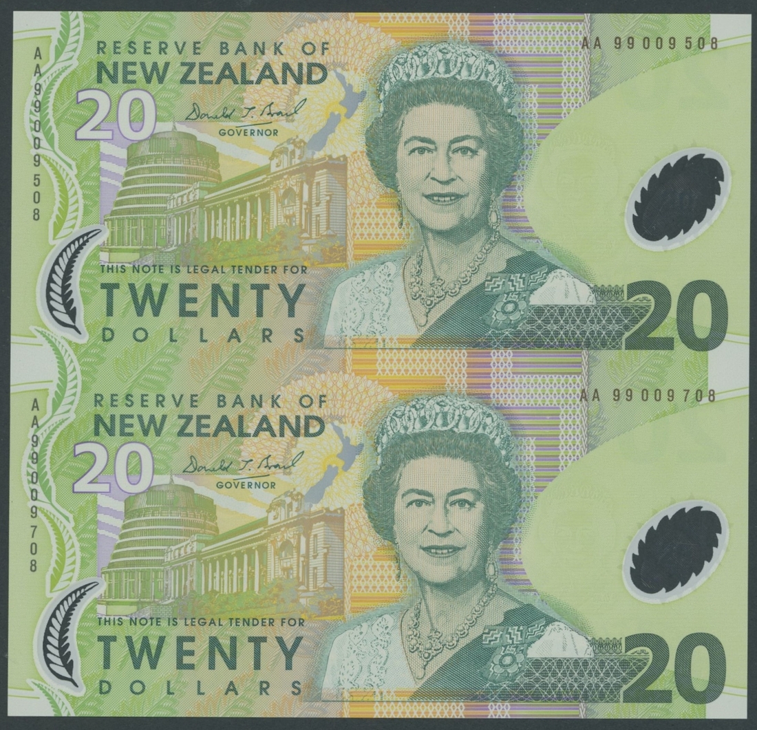 Reserve Bank of New Zealand, uncut pair of $20 polymer notes, 1999, serial numbers AA99009508 and AA99009708, in original holder,
