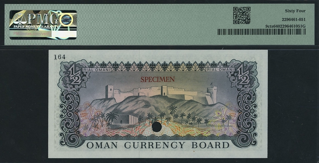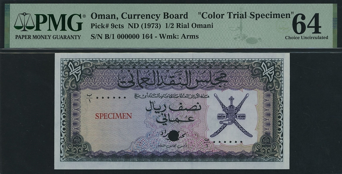 (x) Oman Currency Board, colour trial specimen 1/2 Rial Omani, ND (1973), serial number B/1 000000,