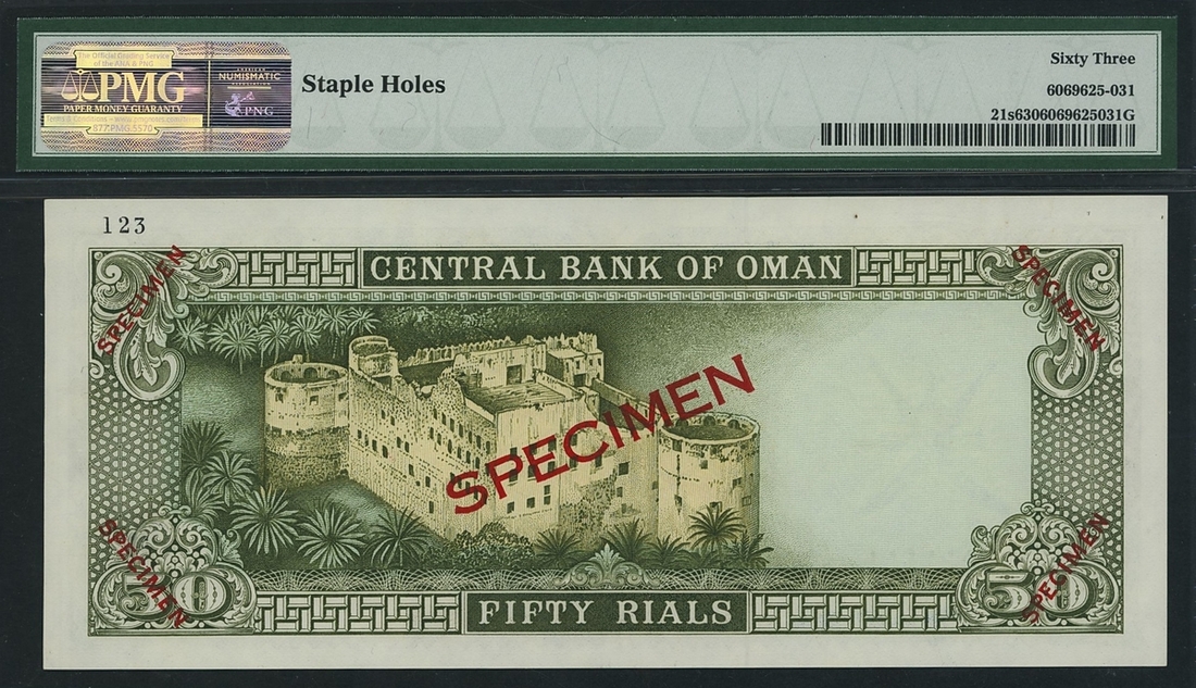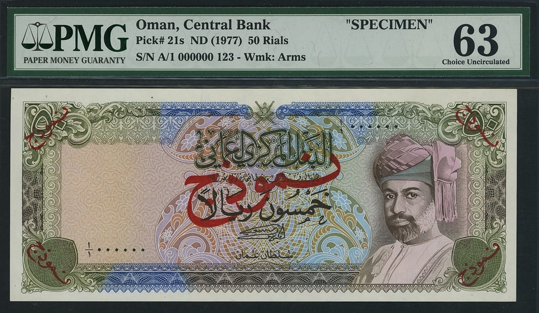 (x) Central Bank of Oman, specimen 50 Rials, ND (1977), serial number A/1 000000,