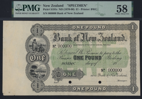 (x) Bank of New Zealand, specimen £1, Dunedin, dated 18--, serial number 000000, hole punched,