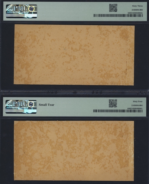 (Unlisted), in PMG holders 63 Choice Uncirculated and 64 Choice Uncirculated, small tear on reverse design (2 notes)
