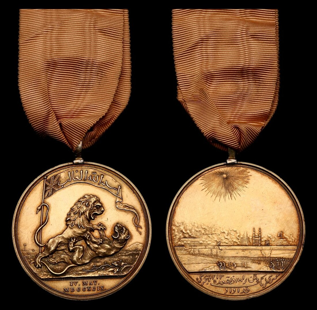 Honourable East India Company Medal for Seringapatam 1799, British Mint striking 48mm, silver-gilt, fitted with contemporary silver-gilt loop for wear some light edge bruising and contact marks, otherwise very fine