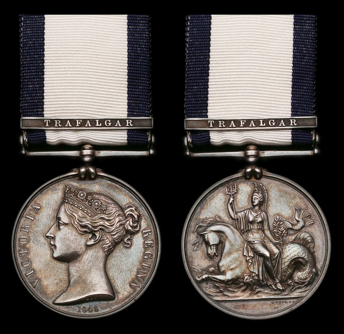 George Porter is a unique name on the published Roll and confirmed with correct entitlement to this medal and clasp. A native of Hull, Yorkshire, and aged 21 at the time of the famous Battle of Trafalgar, Porter served as an Ordinary Seaman aboard the 100-gun ship-of-the-line H.M.S. Britannia. Nicknamed 'Old Ironsides', Britannia was one of the largest vessels in the Royal Navy during the Napoleonic Wars and one of only three British first-rates to participate in that memorable engagement with the combined Franco-Spanish fleet on 21 October 1805.