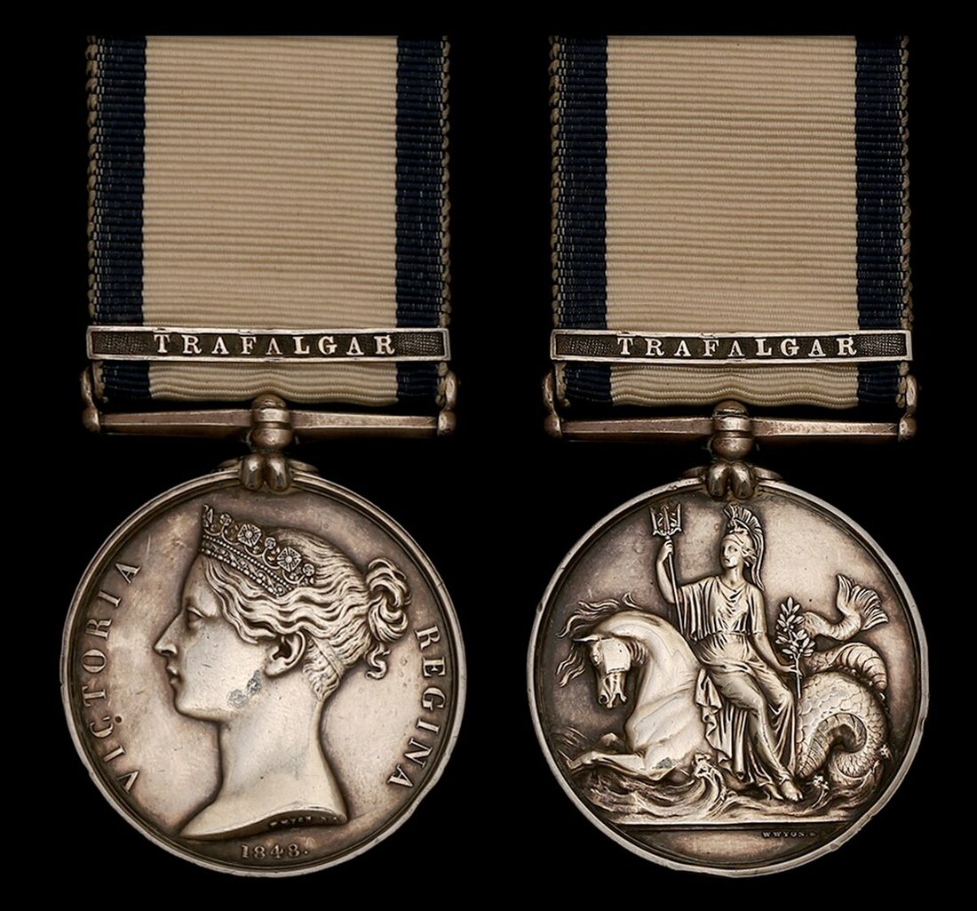 The Naval General Service Medal awarded to Boy W. Pope, Royal Navy, who served aboard Admiral Nelson's Victory at the Battle of Trafalgar at the tender age of seventeen