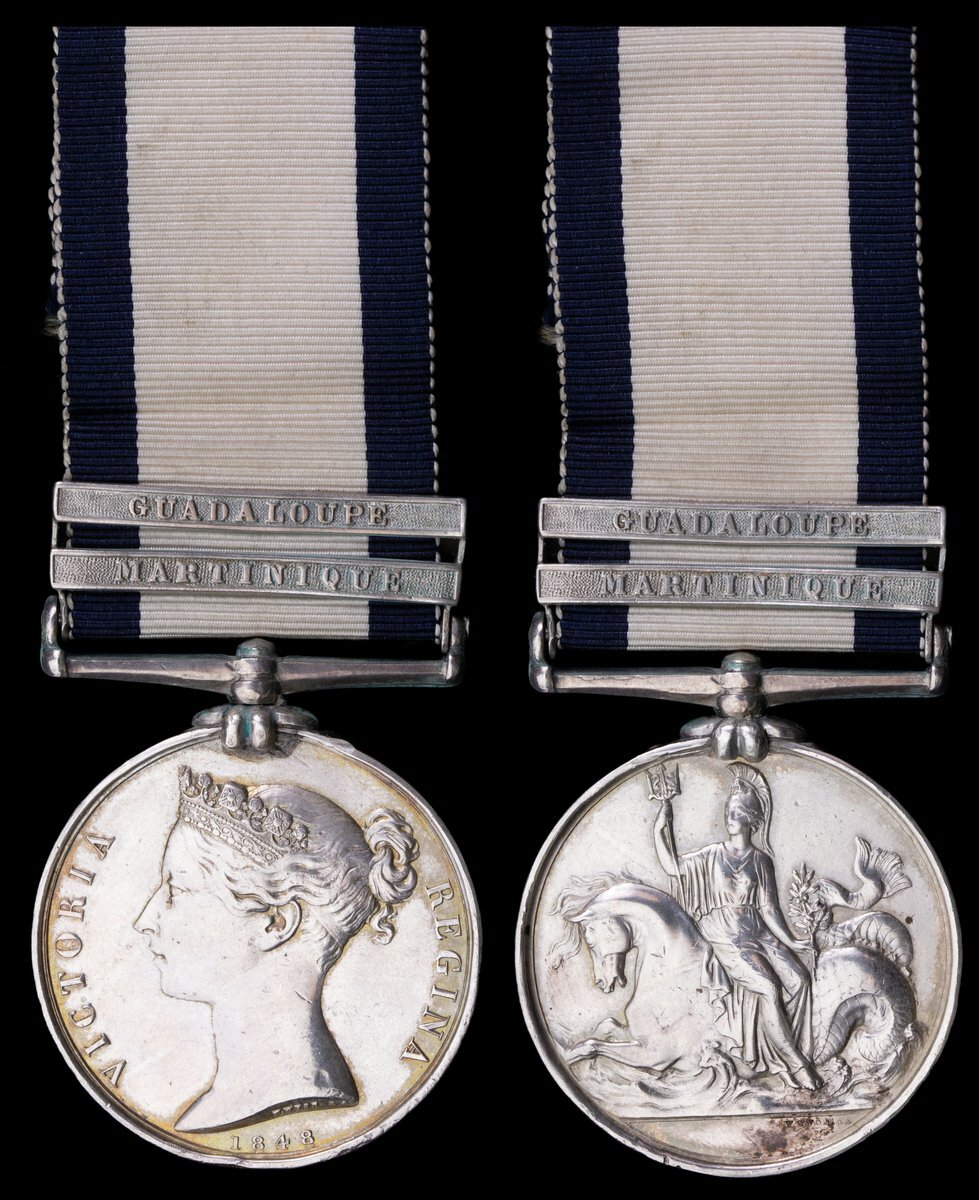 Naval General Service 1793-1840, 2 clasps, Martinique, Guadaloupe (Hugh Charles. Surgeon.), traces of mounting to edge at left and right of suspension claw, and claw re-affixed, nearly very fine