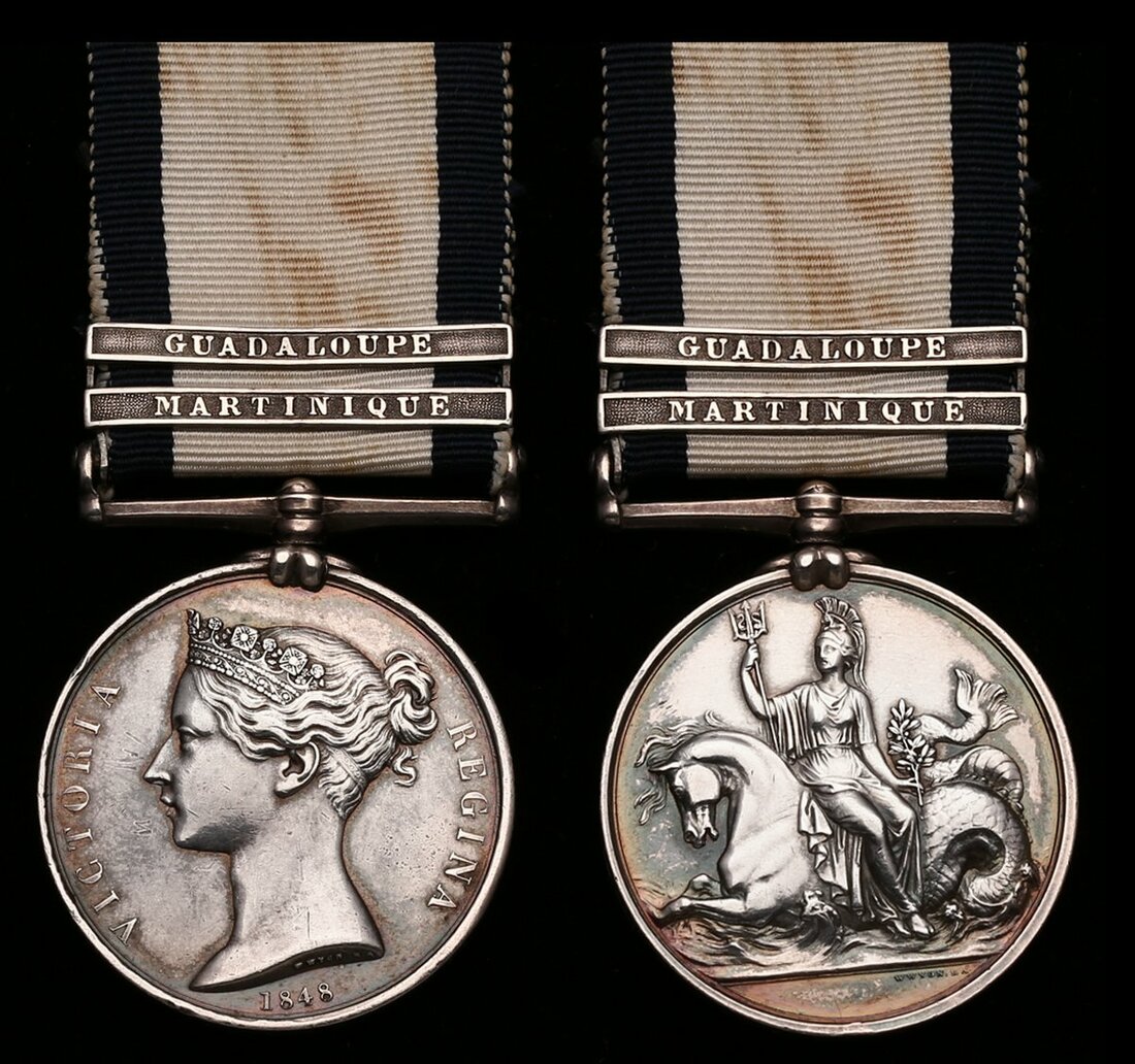 Ordered to the West Indies in anticipation of the upcoming campaign to capture Martinique from the French, Pompee's journey was not uneventful - on 23 May she forced the surrender of a small French vessel off the coast of Cornwall and, off Barbados on 20 October, captured the 16-gun brig Pylade. Participating in the invasion and capture of Martinique (30 January - 24 February 1809), in March Captain William Fahie was appointed to command and, on 17 April, was part of the British squadron which engaged and captured the French 74-gun D'Hautpoul after a running fight lasting several days: smaller British ships had damaged D'Hautpoul's sails and rigging, allowing the larger Pompee to close and finish her off. Coming alongside and engaging broadside-to-broadside at no more than 50 yards, the French fought gallantly for 15 minutes before again attempting to disengage and escape - such was her damage, however, that she eventually surrendered to Pompee after suffering casualties of around 90 men killed and wounded. Interestingly, whilst this action was later commemorated in the clasp 'Pompee 17 June 1809' (note the odd discrepancy in date), Briggs failed to make a claim for it despite being on board at the time - perhaps he was not aware of its existence.