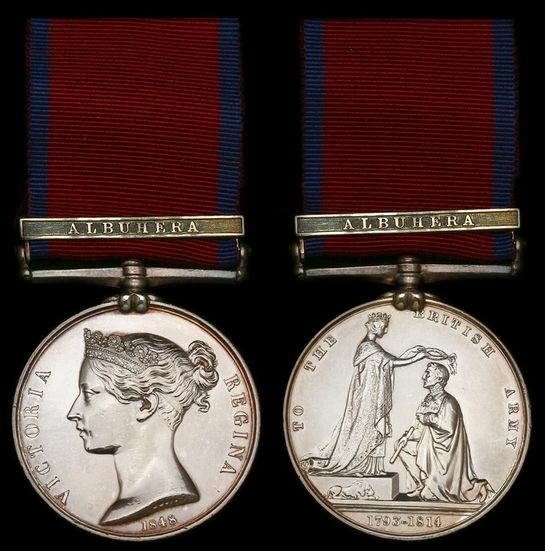 Philip Cook served with the 13th Light Dragoons in the Peninsula, where the regiment had a varied record: at the Battle of Albuera, they were stationed at the narrow Albuera Bridge and later helped to cover Cole's southern advance - the 13th were extremely fortunate to suffer but a single casualty in what is known as the war's bloodiest open battle. They later played a minor role at the Battle of Usagre during Marshal Beresford's pursuit of French General Soult, but were prominently engaged at both the battle of Campo Maior (25 March 1811) and at Arroyo Dos Molinos, in October the same year. In the former engagement, the 13th (barely 200 strong) broke six squadrons of French cavalry and then continued on a wild pursuit of the enemy, subsequently overrunning a convoy of 18 siege guns and literally riding up to the walls of the fortress of Badajoz before retiring in disorder. Upon hearing of this, Wellington severely reprimanded the regiment, calling them a "rabble" and threatening to remove their horses and have the men provide dismounted guard duty in Lisbon! Sir John Fortesque's later assessment was, however, more positive, writing: 'Of the performance of the Thirteenth, who did not exceed two hundred men, in defeating twice or thrice their numbers single-handed, it is difficult to speak too highly'; sold together with the original Spink invoice.