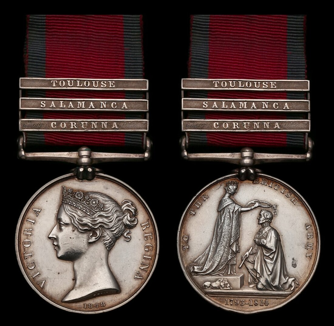 Thomas Darlison is confirmed upon the Medal Roll and is one of only two men of the 36th Foot to claim this number and combination of clasps. Darlison enlisted into the 2nd Battalion, 36th (Herefordshire) Regiment of Foot from the Warwick Militia on 2 September 1807. After transferring to the 1st Battalion in July 1808, he served at the Battle of Corunna (16 January 1809) and on the Walcheren Expedition, from where (like many thousands of men who participated in that abortive campaign) he was invalided home sick and admitted to Haslar Hospital - indeed, the 36th alone lost more than 200 men to malaria.