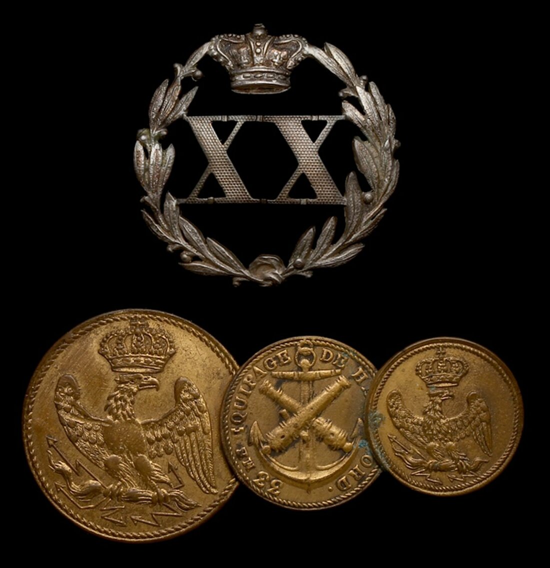 Sold together with a small silver regimental badge bearing the numerals 'XX' below a crown and encircled within a wreath, and three French military buttons, circa 19thC., converted into a brooch - these perhaps mementos of his time on St. Helena.