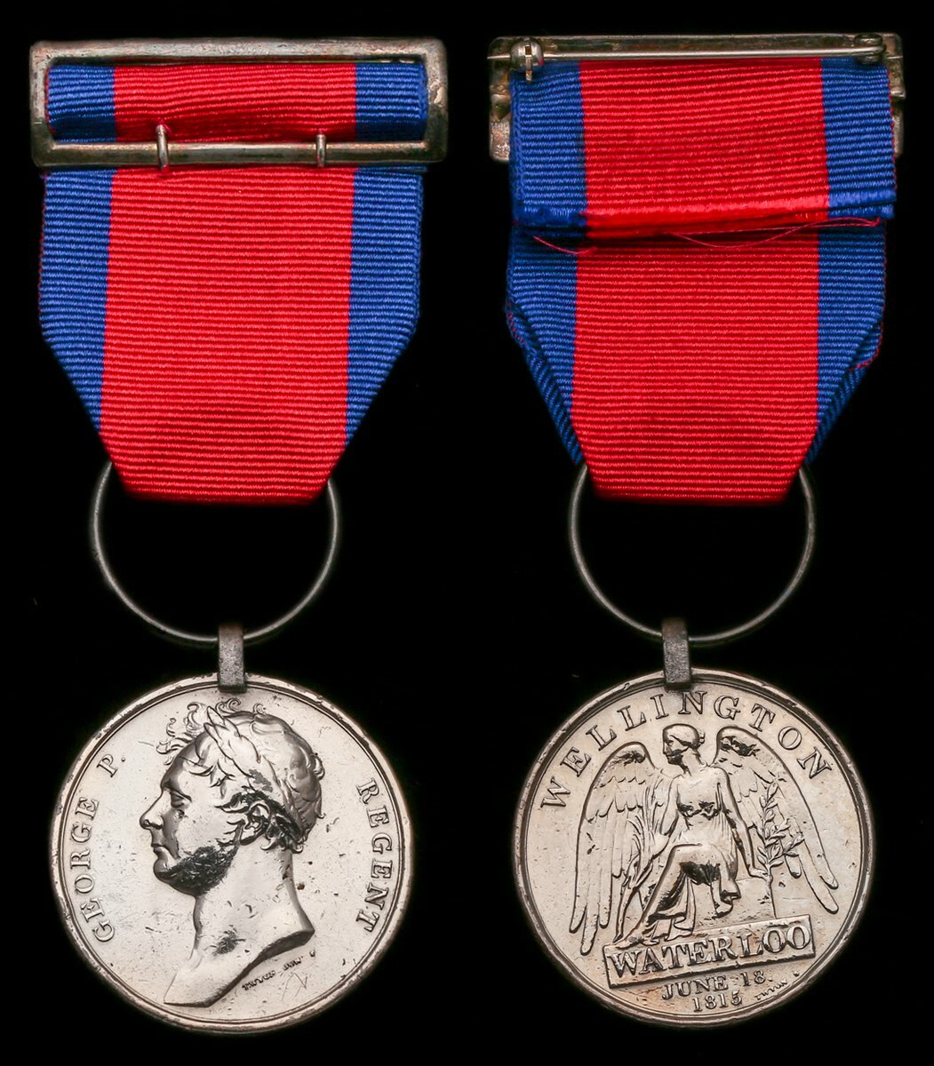 Waterloo 1815, fitted with steel clip and ring suspension (Charles Pink, 1st Reg. Dragoon Guards.), fitted with a white metal mounting bar for wear, edge bruises and contact marks, otherwise very fine