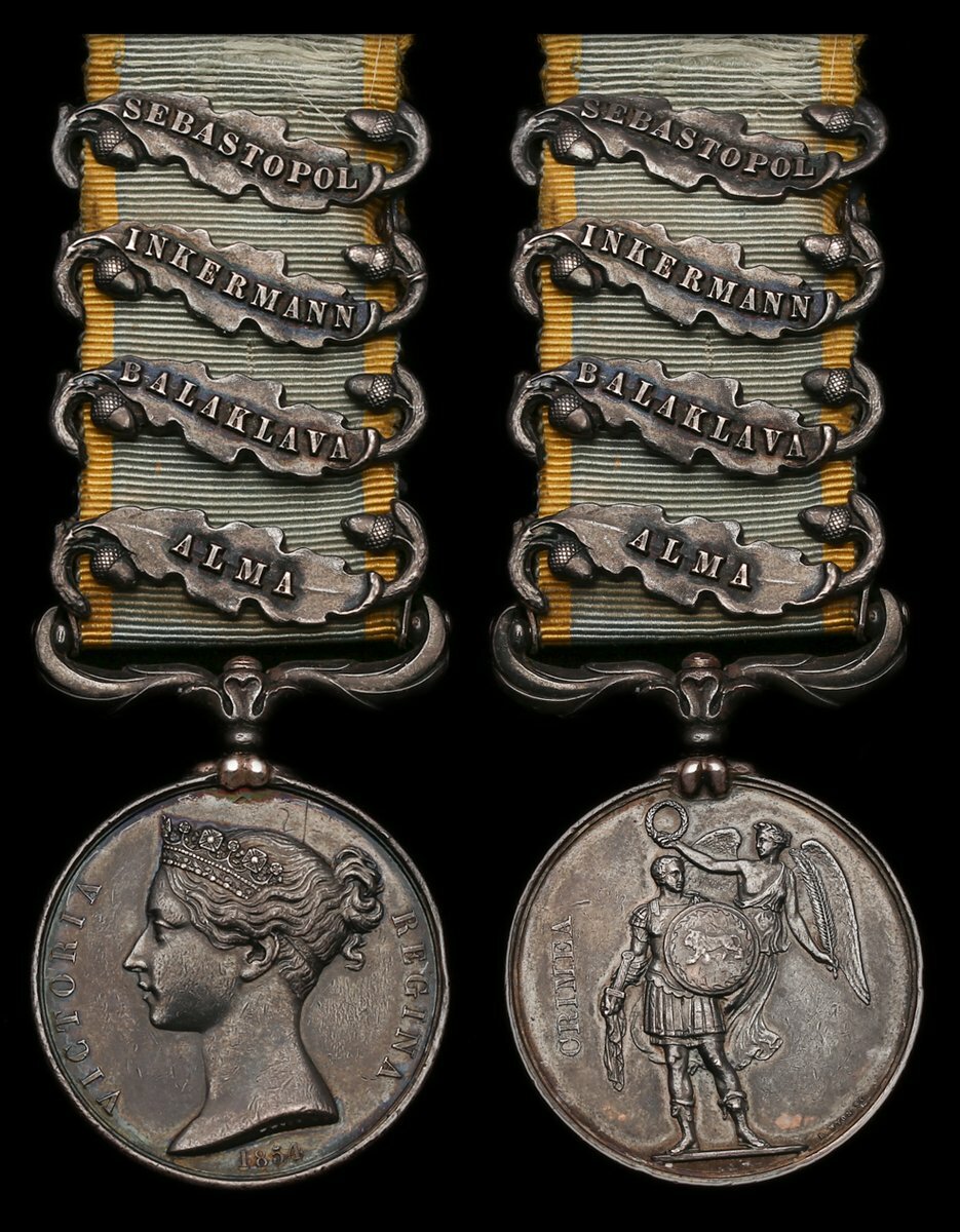 Crimea 1854-56, 4 clasps, Alma, Balaklava, Inkermann, Sebastopol (Corpl W. Greening. 4th Lt Dragns.), officially impressed naming, lugs removed from top clasp, otherwise toned, some light edge bruising and contact marks, otherwise very fine