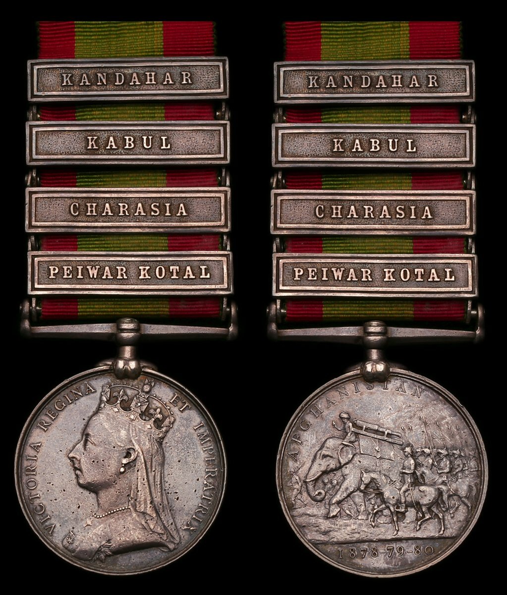 Edward Purcell served with the 72nd Foot in India, he was noted as being stationed at Umballa in 1871. He was still in India when the Regiment went into action at the Battle of Peiwar Kotal. They formed part of the main storming party which slipped along the Spingawi Kotal to attack the Afghan forces in the flank, storming the steep and heavily defended position alongside the Gurkhas. At Charasia they again formed alongside the Gurkhas to attack the centre of the Afghan line storming not one but two defensive lines. Finally the unit was present for the defence of Kabul in the winter of 1879 and the Kabul to Kandahar March, reaching the city of Kandahar in time to defeat Ayub Khan. They stormed the heights above the city and captured the village of Gundigan at bayonet point. Purcell was discharged on 4 March 1884. He is further entitled to a Kabul to Kandahar Star (sold Noble's 8-11 April 2008, Lot 4920), an Egypt 1882-89 medal with clasp Tel-El-Kebir and a Khedive's Star dated 1882.