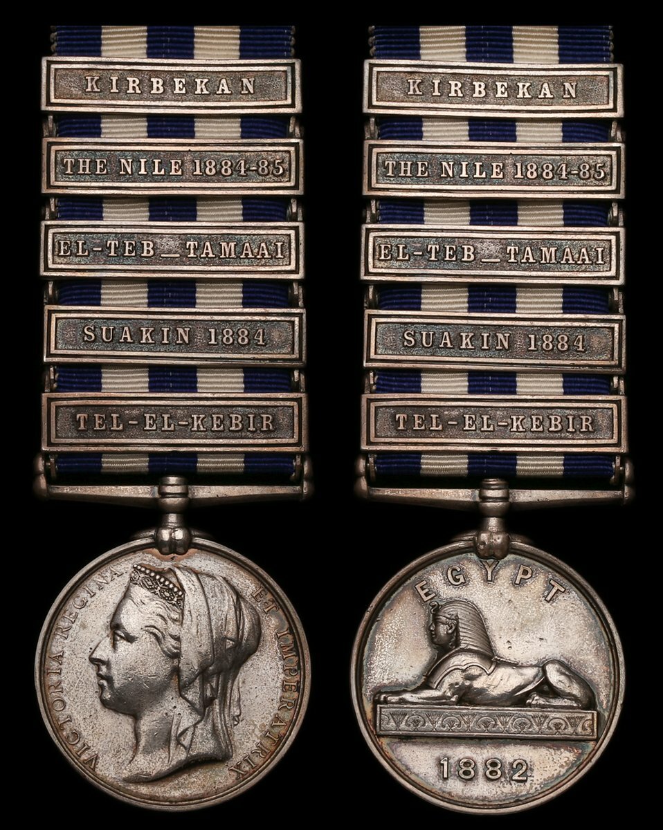 (x) Egypt and Sudan 1882-89, dated reverse, 5 clasps, Tel-El-Kebir, Suakin 1884, El-Teb_Tamaai, The Nile 1884-85, Kirbekan (1016 Pte. D. Stoddart, 1/R. Hrs.), minor pitting and contact wear, overall very fine