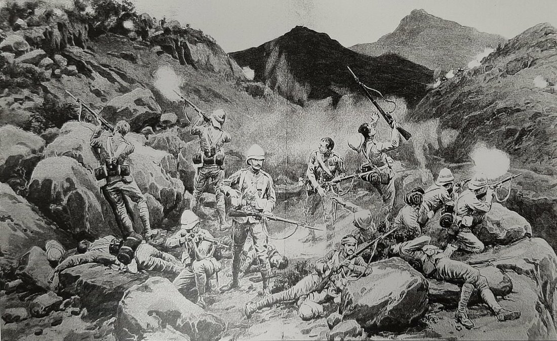 'During the advance but few of the enemy showed themselves, but in the retirement, which began at 2 p.m., the Northamptonshire Regiment forming the rear-guard was closely pressed. Its movement from the crest into the valley, which was much delayed by the steepness of the descent and by the number of wounded men who had to be carried by their comrades, was covered by the guns, the flanks being held by the two Sikh regiments [15th & 36th]. Eventually a portion of the Northamptonshire Regiment became entangled in a deep ravine, where they were fired into at close quarters by the tribesmen. The 36th Sikhs were sent back to extricate them, but evening was coming on, and before assistance could be rendered a party consisting of an officer and 12 men was cut off and shot down. Had the battalion kept to the high ground where its flanks were protected by the two Sikh regiments, its loss would probably have been small; but unfortunately a route was chosen which offered every tactical advantage to the enemy, the result being that some of our troops became isolated, and were then attacked in overwhelming numbers.'