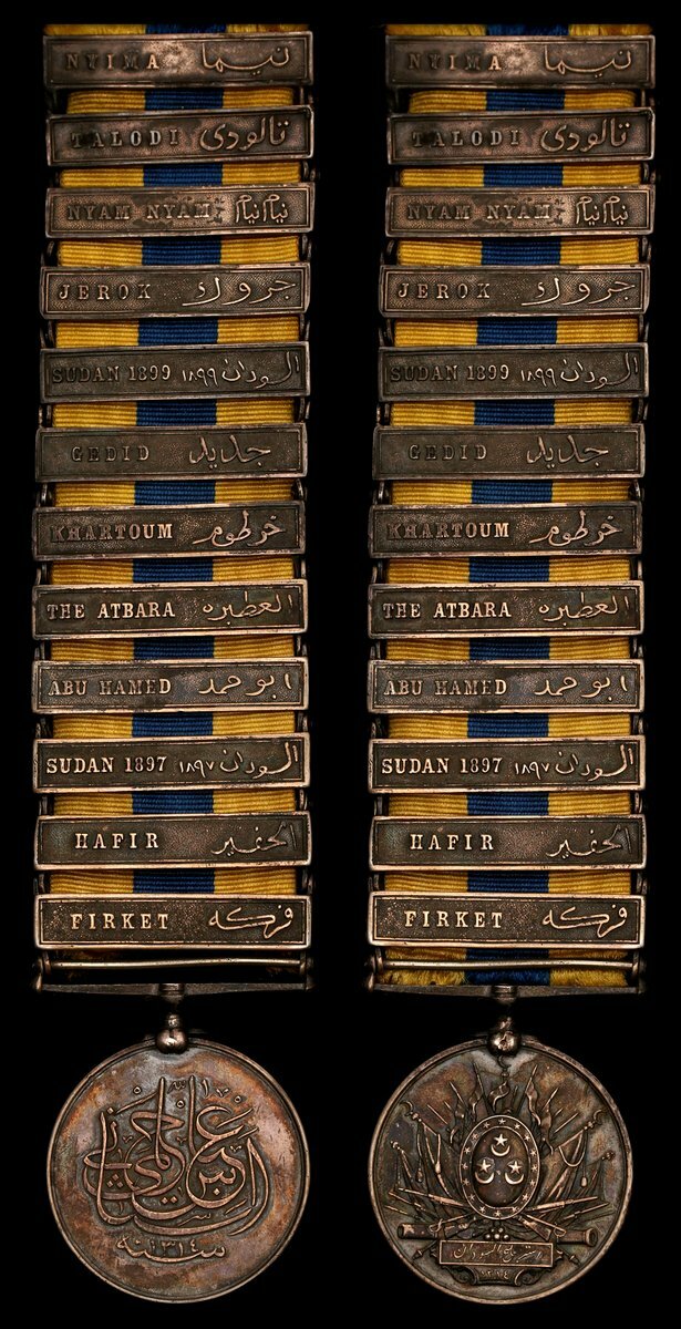 (x) Khedive's Sudan 1896-98, 12 clasps, Firket, Hafir, Sudan, Abu Hamed, The Atbara, Khartoum, Gedid, Sudan 1899, Jerok, Nyam Nyam, Talodi, Nyima, unnamed as issued, first five clasps with uniform rivets, the remainder differing, suspension loose, very fine