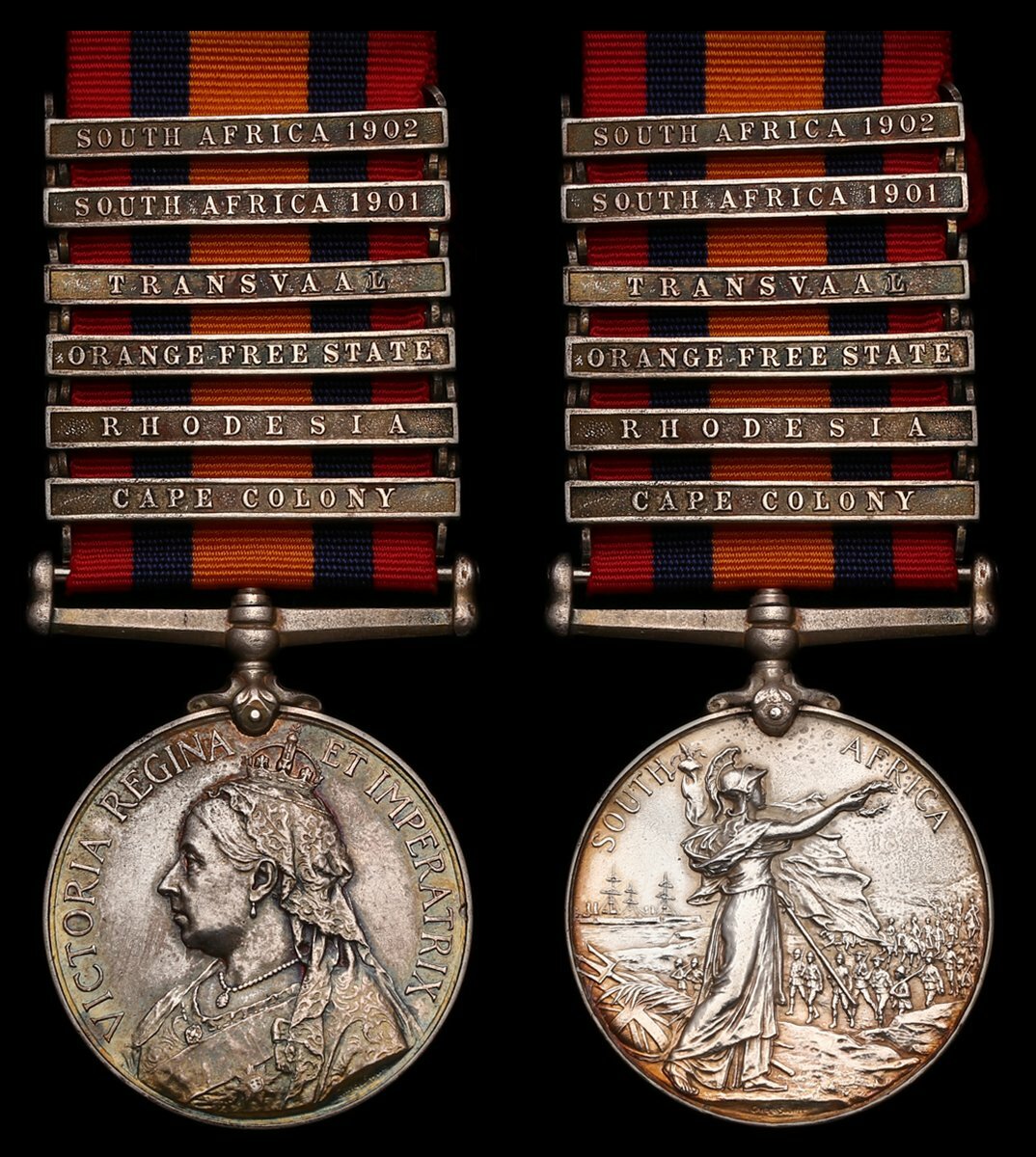 (x) Queen's South Africa 1899-1902, 6 clasps, Cape Colony, Rhodesia, Orange Free State, Transvaal, South Africa 1901, South Africa 1902 (542. Tpr. A. A. Doudney. C.B.C.), impressed in larger size capitals as officially done, clasps not attached to medal but found as a block of four and a top block of two, with a New South Wales Cyclists Touring Union badge and a Northern Suburbs B.C. badge, very fine throughout (3)