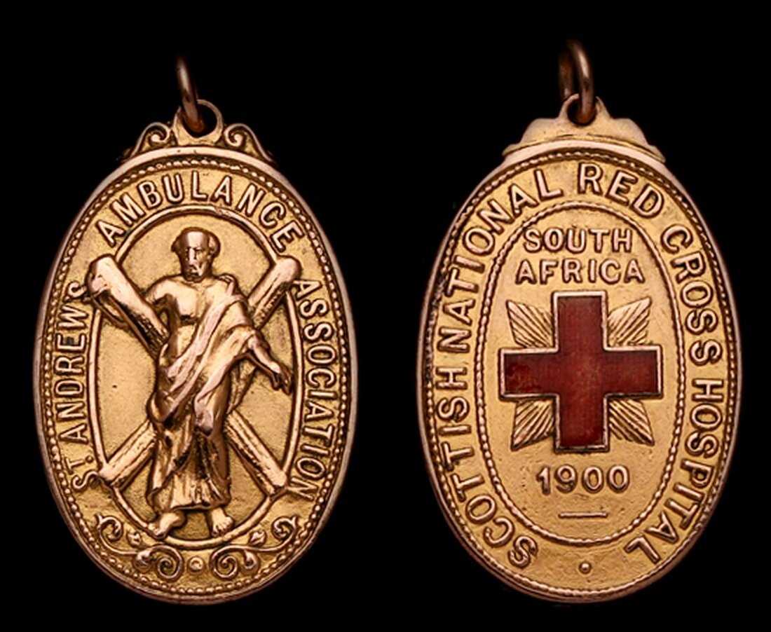 Scottish National Red Cross Hospital and St. Andrew’s Ambulance Association Tribute Medal 1900 (Grace M. Girdler), 30mm x 20mm, gold and enamel, good very fine and rare