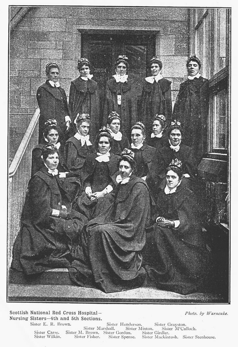 'The presentation of South African medals and commemorative badges to the members of the staff of the Scottish National Red Cross Hospital took place yesterday in the Queen's Rooms, Glasgow. General Sir Archibald Hunter, K.C.B., Commanding the Forces in Scotland, presented the medals, while her Grace, the Duchess of Montrose handed over the commemorative badges, which were the gift of the Scottish Red Cross Society. The recipients included the surgeons, the nurses, and the orderlies, and they numbered 96 in all. Many of the orderlies were medical students. In the case of the half-dozen nurses, commemorative badges only were presented, the "sisters" having already received their medals from the King. The ceremony attracted a crowded audience, while many hundreds more assembled outside the hall to obtain a glimpse of the distinguished visitors who had come to honour the civilian heroes of the war.'