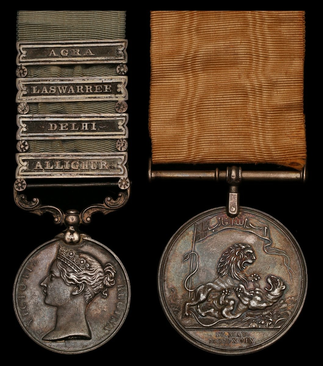 Seringapatam 1799 (Captain J. Horsford Bengal Artillery), silver, 45mm, naming engraved in upright capitals, affixed with a silver post and straight-bar suspension; Army of India 1799-1826, long-hyphen reverse, 4 unofficial clasps, Allighur, Delhi, Laswarree, Agra (Colonel J. Horsford. Bengal Artillery), contemporarily engraved naming in upright capitals, a few minor contact marks to both, generally about very fine (2)