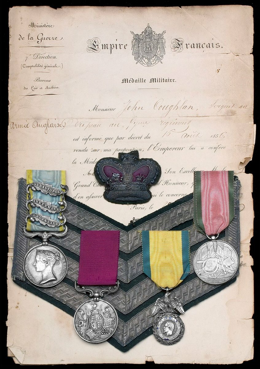 Crimea 1854-56, 3 clasps, Balaklava, Inkermann, Sebastopol (No. 1569 Colr. Serjt. John Coughlan 57th Regt.), regimentally impressed naming; Army L.S. & G.C., V.R., small letter reverse (1569. Cr. Serjt. John Coughlan, 57th Foot); Medaille Militaire, silver, gilt and enamel, badly chipped; Turkish Crimea 1855, Sardinian issue (1569 Colr. Segr. John Coughlan, 57th Regiment), sold together with the original award document for the Medaille Militaire, nearly very fine (4)