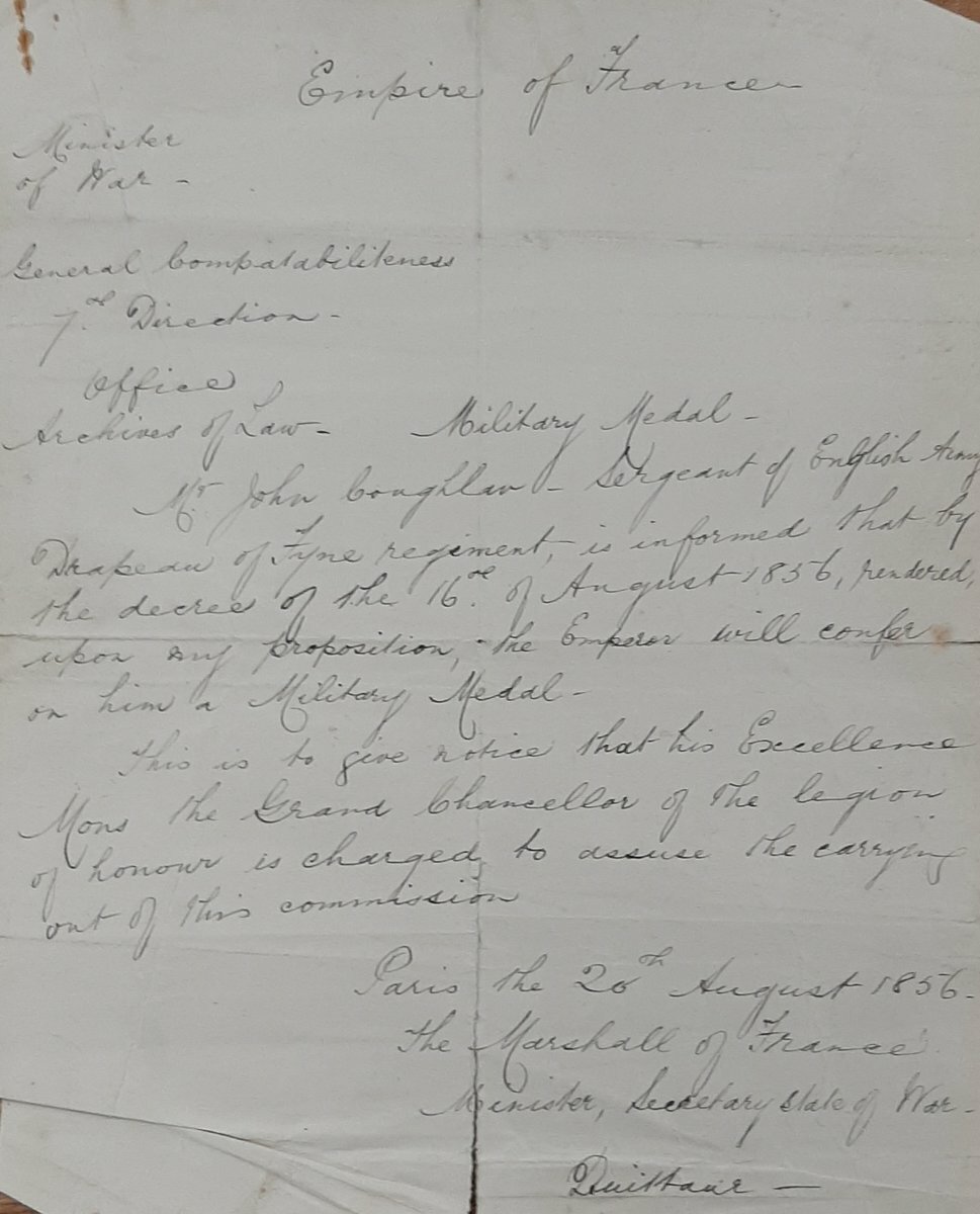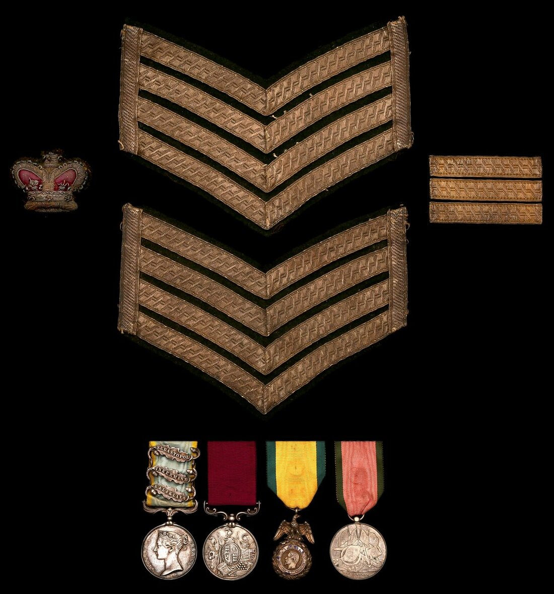 Sold together with copied research including census data, service papers and original material comprising a contemporary cutting from a local newspaper, original award document for Medaille Militaire, dated 20 August 1856, this much repaired, two sergeant's stripes and bullion crown.