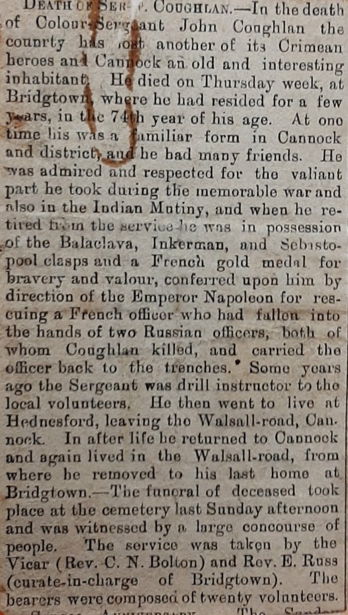 'In the death of Colour-Sergeant John Coughlan the county has lost another of its Crimean heroes and Cannock an old and interesting inhabitant. He died on Thursday week, at Bridgetown, where he had resided for a few years, in the 74th year of his age. At one time he was a familiar form in Cannock and district and he had many friends. He was admired and respected for the valiant part he took in the memorable war and also in the Indian Mutiny [no trace on medal roll, regiment not present], and when he retired from the service he was in possession of the Balaklava, Inkerman, and Sebastopol clasps and a French gold medal for bravery and valour, conferred on him by direction of the Emperor Napoleon for rescuing a French officer who had fallen into the hands of two Russian officers, both of whom Coughlan killed, and carried the officer back to the trenches. Some years ago the Sergeant was drill instructor to the local volunteers. He then went to live at Hednesford, leaving the Walsall-road, Cannock. In after life he returned to Cannock and again lived in the Walsall-road, from where he removed to his last home in Bridgetown.'