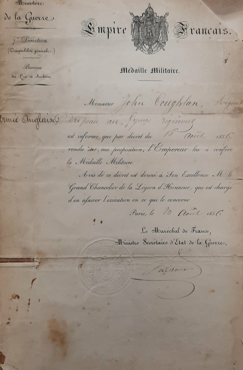 John Coughlan was born at Killenaule, County Tipperary, and was attested for the 57th Foot at Kilkenny on 24 February 1841. Advanced Corporal in January 1847 and Sergeant in October 1848 it was in that rank that he served during the Crimean War.