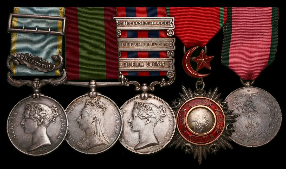 Crimea 1854-56, 1 clasp, Sebastopol (Bt Major C. G. Arbuthnot. R.A.), naming officially engraved by Hunt & Roskell; Afghanistan 1878-80, no clasp (Brigr. Gen. C. G. Arbuthnot. R.A.); India General Service 1854-95, 3 clasps, Burma 1885-7, Burma 1887-89, Chin-Lushai 1889-90 (Lt. Genl Sir C. G. Arbuthnot. Rl Arty.); Turkey, Ottoman Empire, Order of Medjidie, 5th Class breast Badge, silver and enamel; Turkish Crimea 1855, Sardinian issue, (Bt. C. G. Arbuthnot. R.A.) the first with an attractive silver clasp, light contact wear, overall good very fine (5)