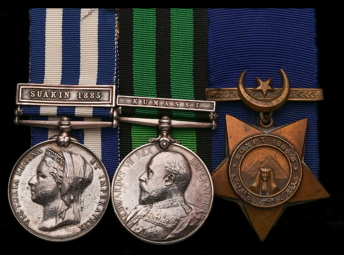 Egypt 1882-89, undated reverse, 1 clasp, Suakin 1885 (3074, 2nd CL: S.Sgt P. Shanley. 3rd Co. C & T.C.); Ashanti 1900, silver issue, 1 clasp, Kumassi (S.Serjt:-Maj: P. Shanley. A.S.C.); Khedive's Star, dated 1884-6, court mounted for display pitting from Star, otherwise very fine (3)