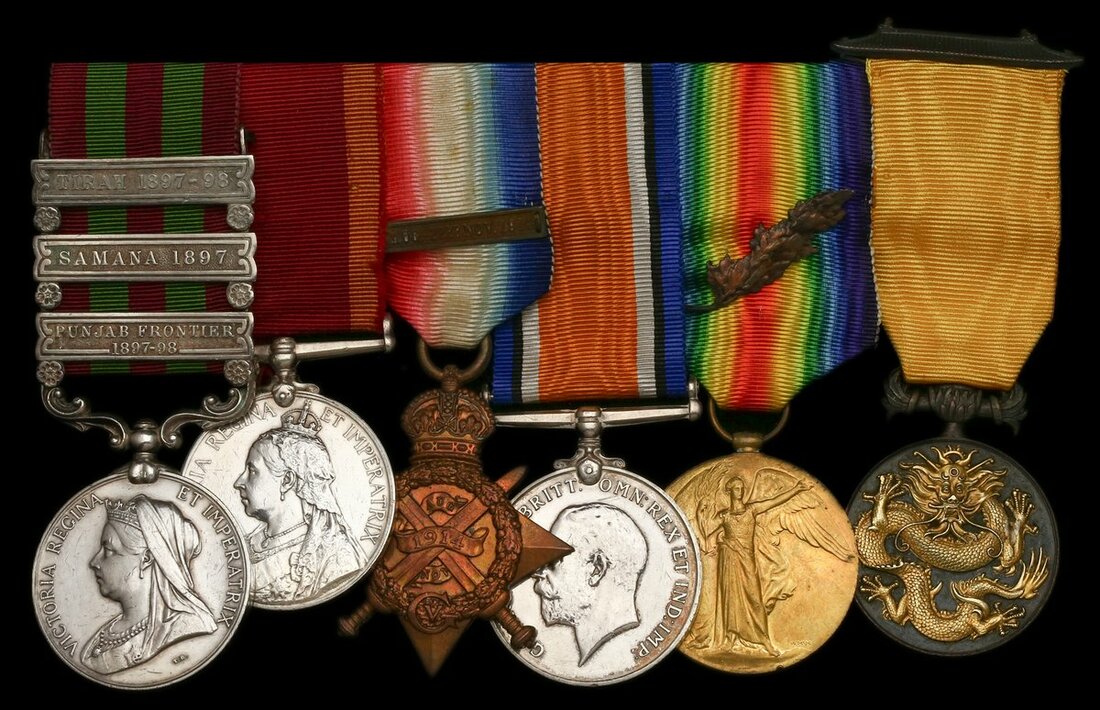 India General Service 1895-1908, 3 clasps, Punjab Frontier 1897-98, Samana 1897, Tirah 1897-98 (Surgn Captn L. A. Mitchell A.M. Staff); China 1900, no clasp (Capt: L. A. Mitchell. M.B. R.A.M.C.); 1914 Star, clasp (Lt: Col: L. A. Mitchell. R.A.M.C.); British War and Victory Medals, with M.I.D. oak leaves (Lt. Col. L. A. Mitchell.); United States of America, Military Order of the Dragon, fitted with pagoda riband bar (Capt. Lionel A. Mitchell Royal Army Medical Corps No. 583.), mounted as worn, very fine (6)